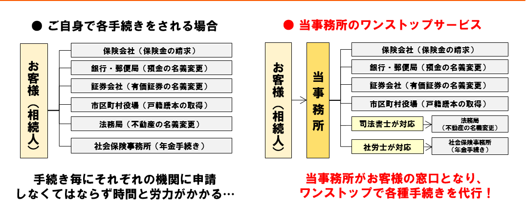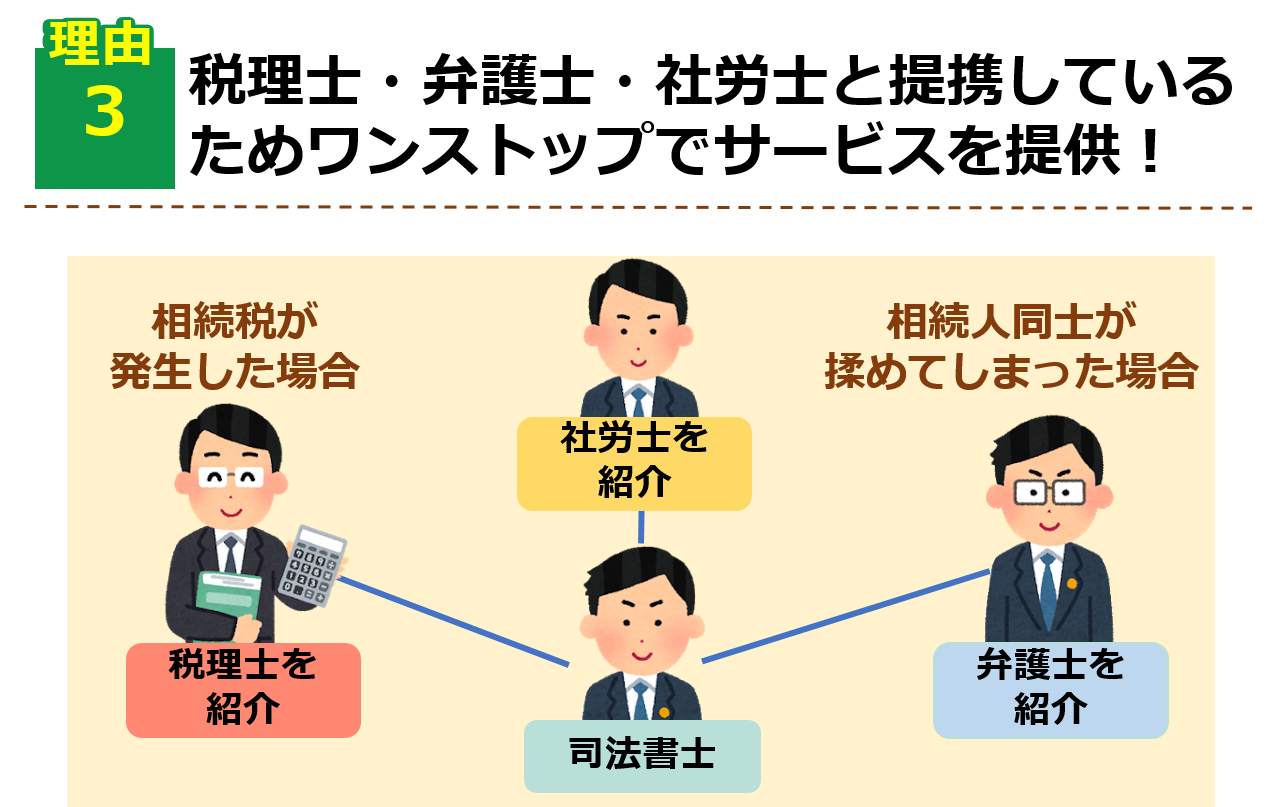 各士業と連携しているため、相続手続きをワンストップサポート致します。