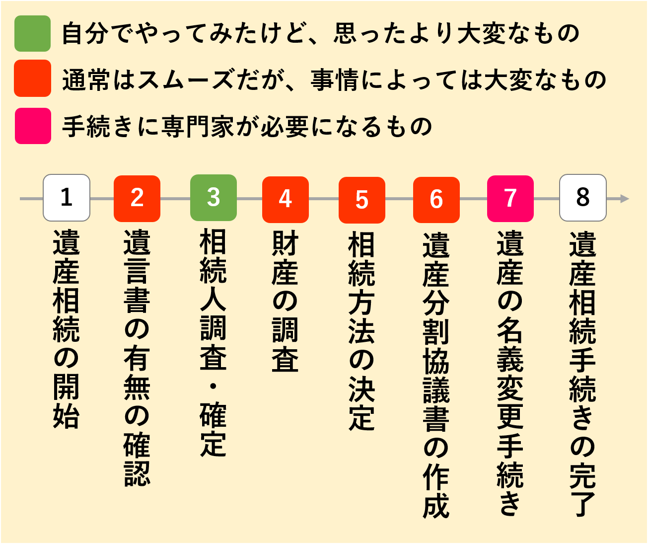 等々、様々な“つまづき”ポイントが分かってきました。これから相続手続きを進める方にとっての道標となるよう、それらを色分けして分かりやすくまとめてみました。