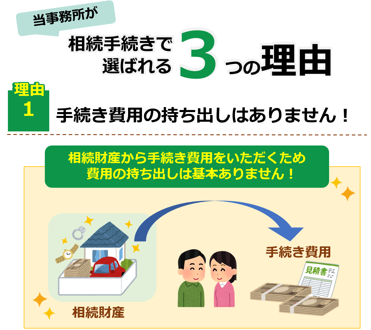当事務所に相続手続き(遺産整理業務)をご依頼いただいた場合は、相続財産の中から手続き費用をいただくため、費用の持ち出しは基本的にありません。