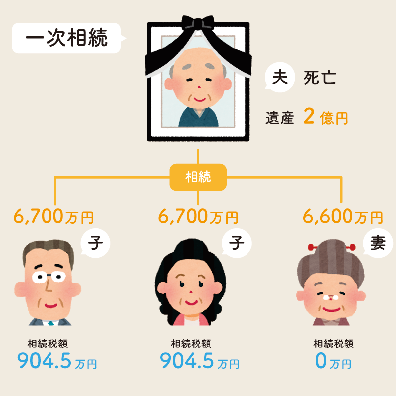 一次相続の相続人として配偶者と子供がいた場合、一次相続では配偶者が多く財産を受け取るようにして節税したつもりが、二次相続(配偶者から子供への相続)も含めると、相続税の総額が高くなってしまう、というケースが起こり得るのです。
