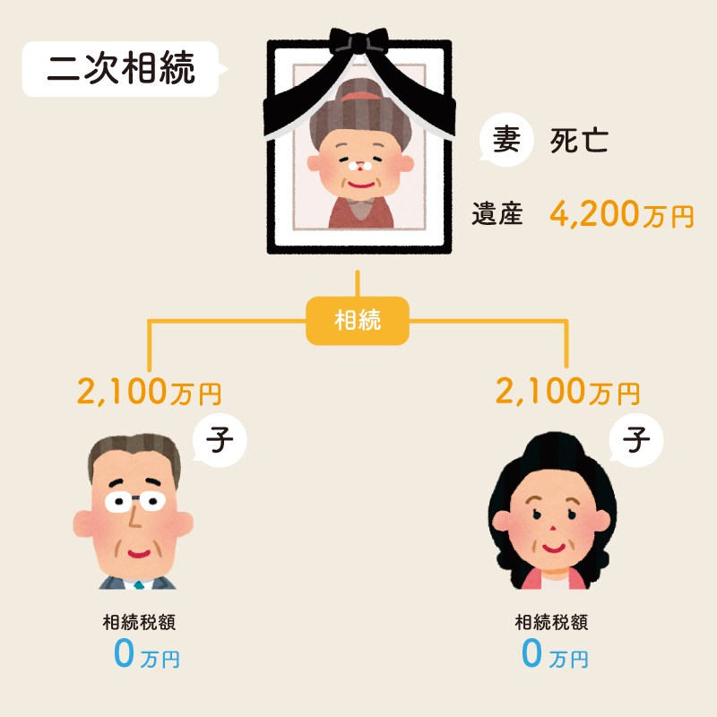 妻の遺産4,200万円を、子供2人が2,100万円ずつ相続。二次相続においての相続税額は0に!