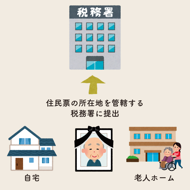 基本的に入居の際に住民票を老人ホームの住所に移しているため、申告書の提出先は、老人ホームの住所地を管轄する税務署になります。