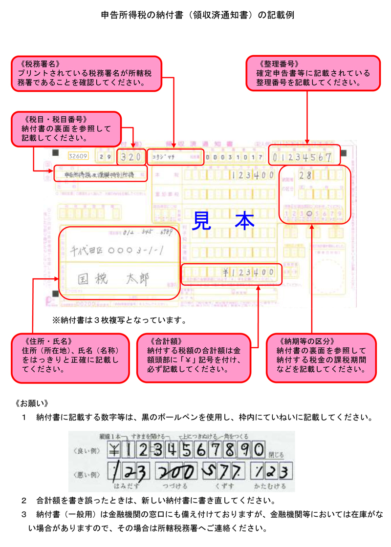 税務署あるいは金融機関の窓口で、作成した納付書と現金で一括で納付します。